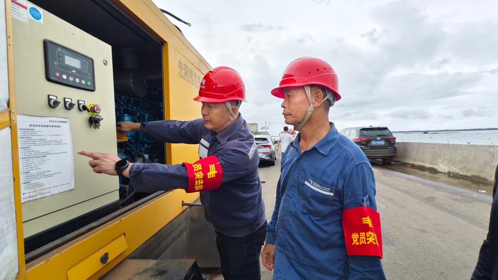 9月22日,南方電網(wǎng)廣東湛江徐聞供電局錦和供電所黨支部書記黃國軍(左)與同事在六極島下角村碼頭旁調(diào)試發(fā)電機(jī)。